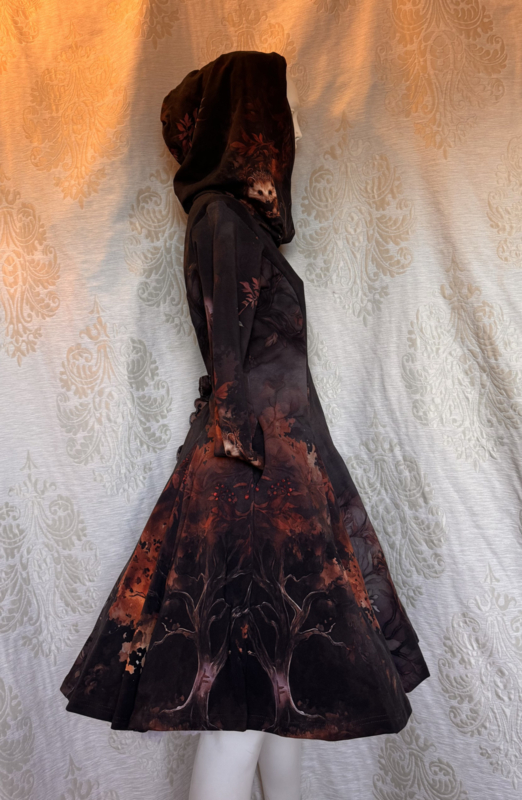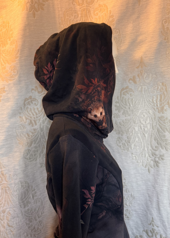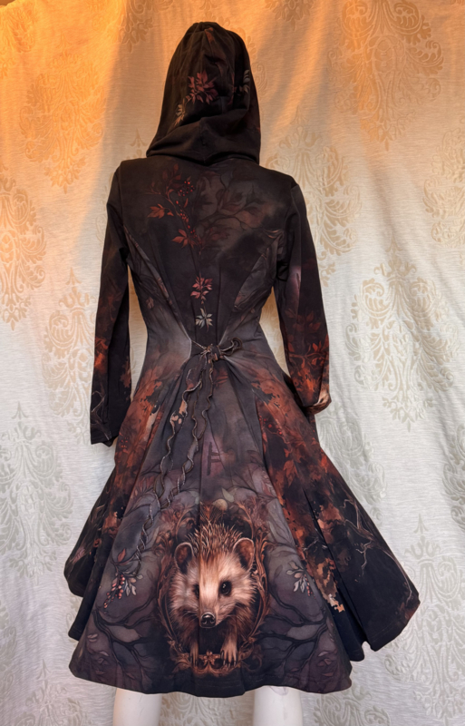 Mooie halflang jurkje met zelfontworpen hedgehog print. Het jurkje heeft een hoodie en zakken. Het is gemaakt van zacht french terry katoen 95% / 5% elastan.