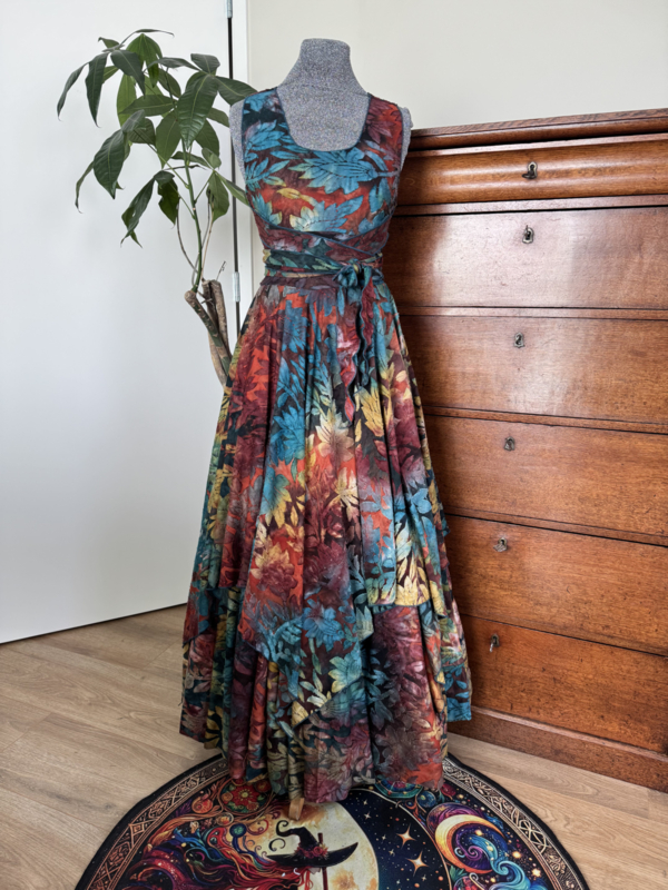 Met de lange rok ruche onder het jurkje heeft het als set een feestelijke uitstraling. Los van elkaar kan het ook zeer goed casual gedragen worden.
