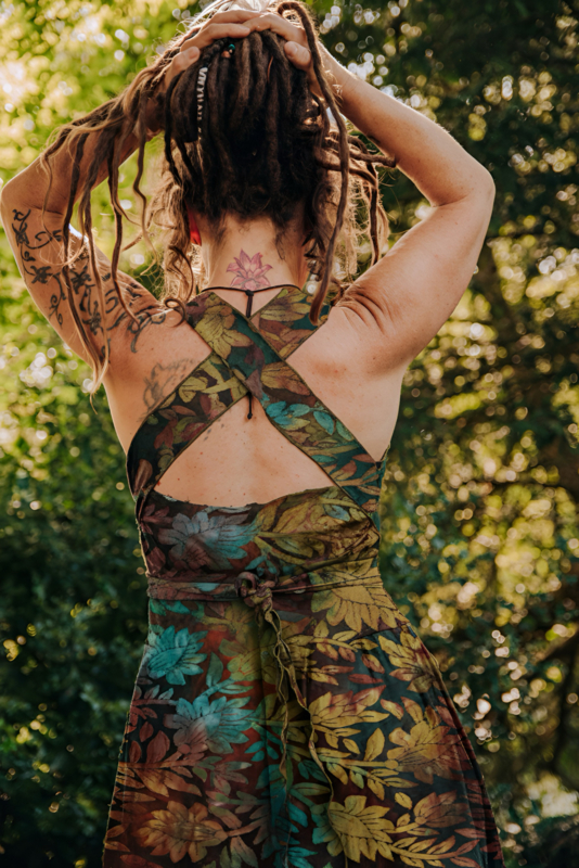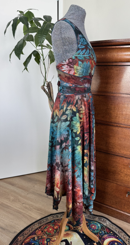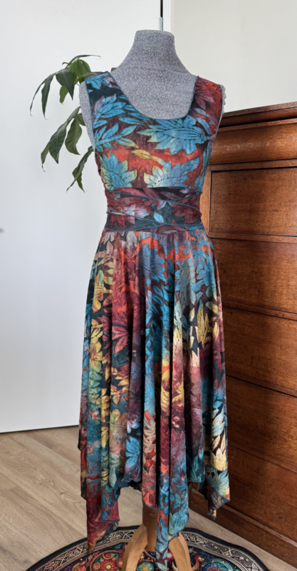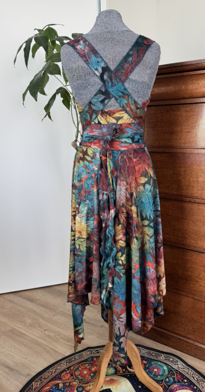 Heerlijk zomerjurkje met kruisbanden en punten ausbrenner. De kruisbanden kun je op verschillende manieren om het lijf wikkelen.