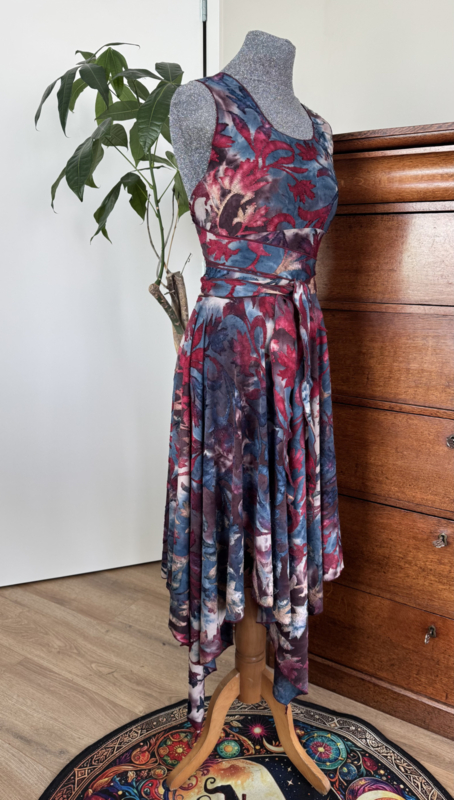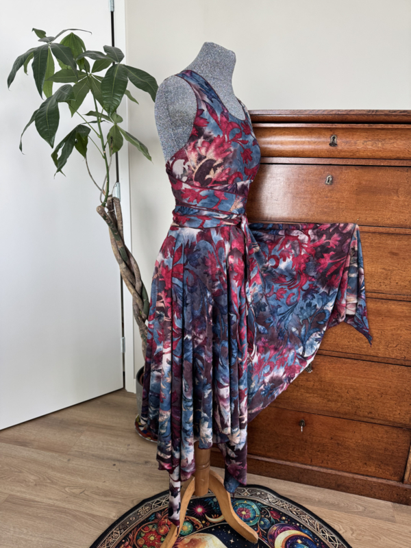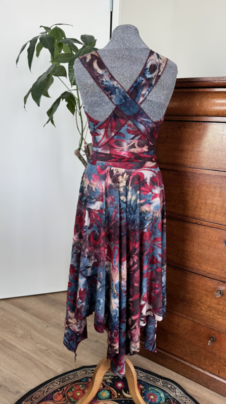 Heerlijk zomerjurkje met kruisbanden en punten ausbrenner. De kruisbanden kun je op verschillende manieren om het lijf wikkelen.